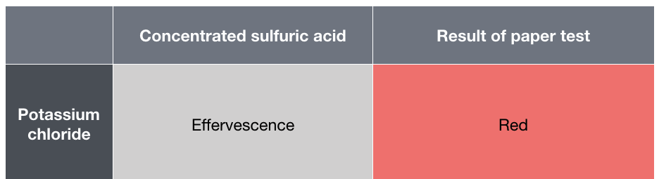 State the results of when potassium chloride reacts with concentrated sulfuric acid. Include the paper result.