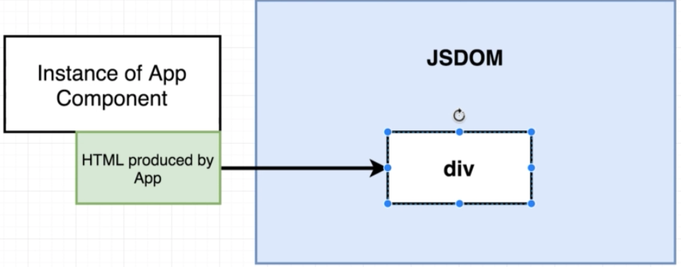 3) So then, React takes the App Component and creates the HTML produces by the App and sticks it in JSDOM’s div element
