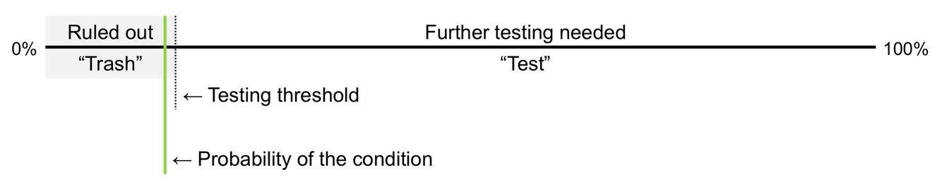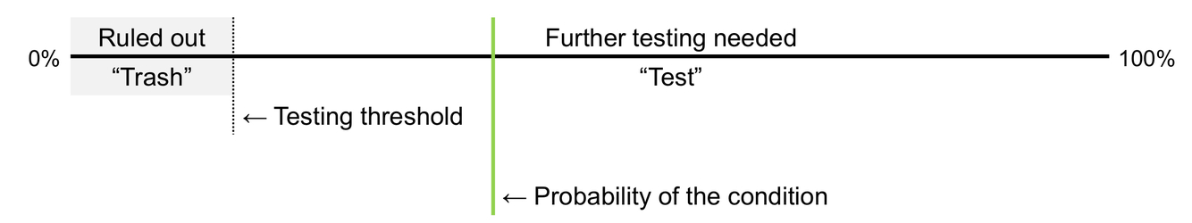 3) When the probability of disease is above a testing threshold, further testing or other management is needed. When it is below a testing threshold, we stop diagnostic work-up for that condition.