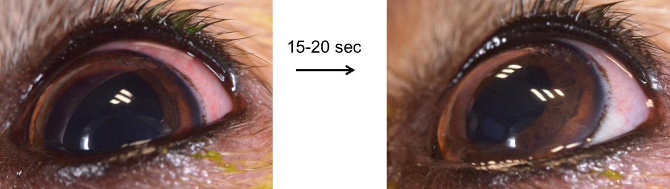observation si blanchissement de la conjonctivite bulbaire/vasoconstriction des vaisseaux superficiels en 15-30s
