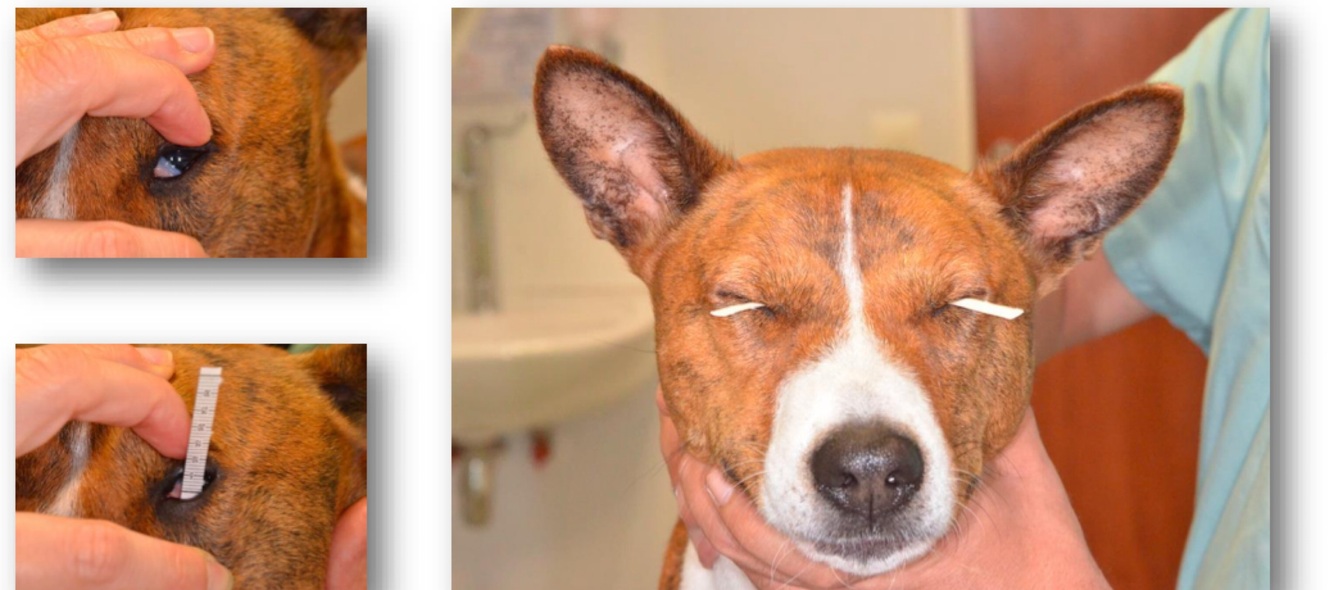 bandelette dans cul de sac conjonctival ventral, 2 yeux, laisser 1 min