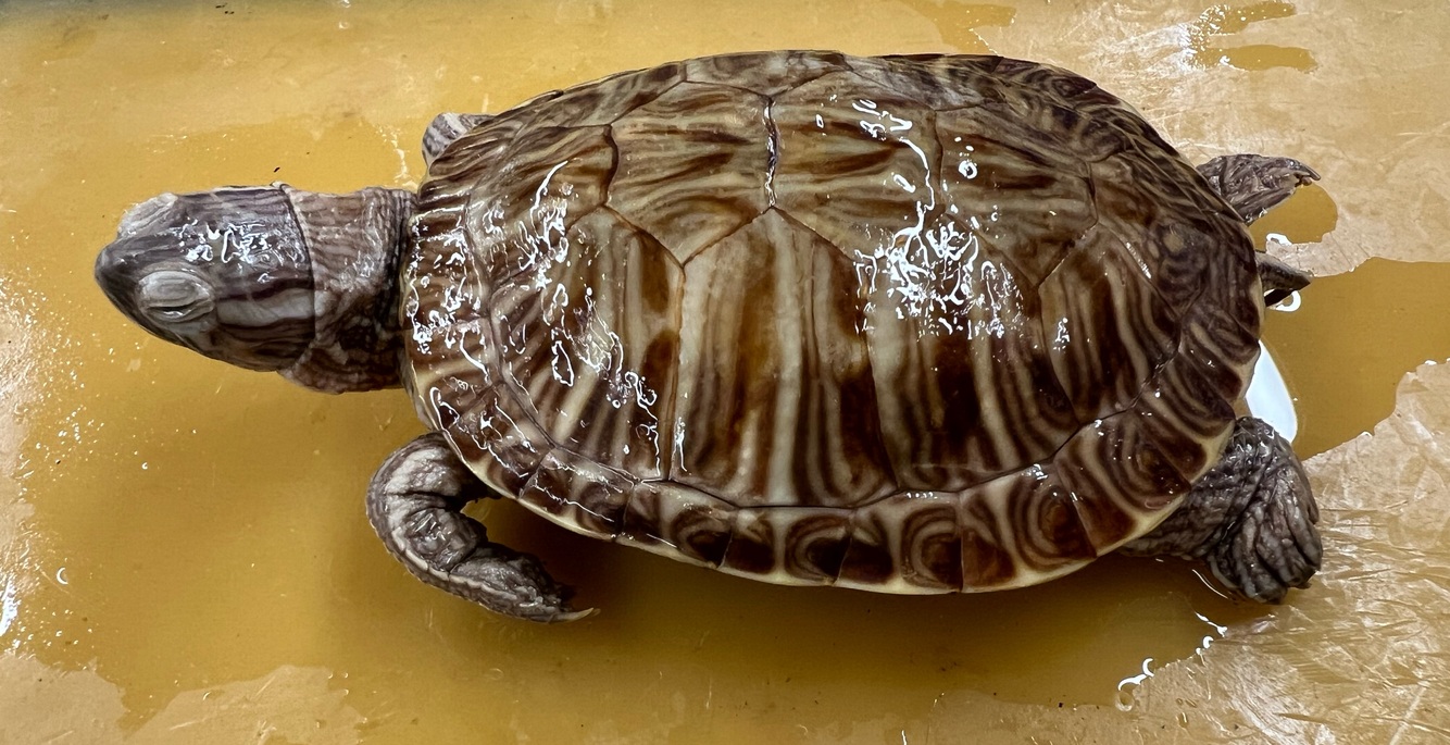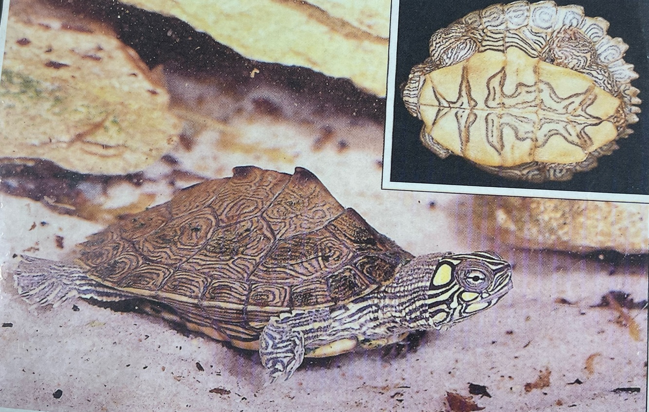 Characteristics: Carapace without vertebral ridge; plastron with light stripes; adult shell length rarely more than 4.5 inches (11cm)