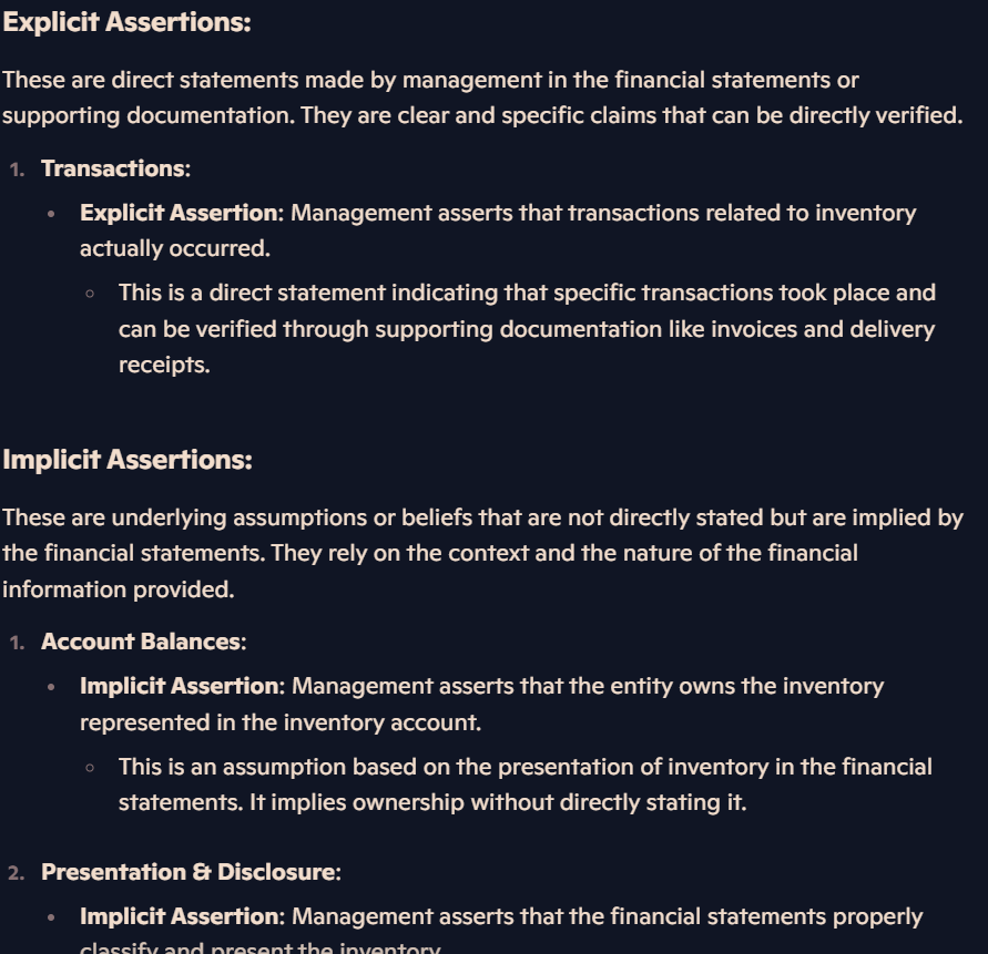 Financial statements issued by management contain explicit and implicit assertions. E.g.