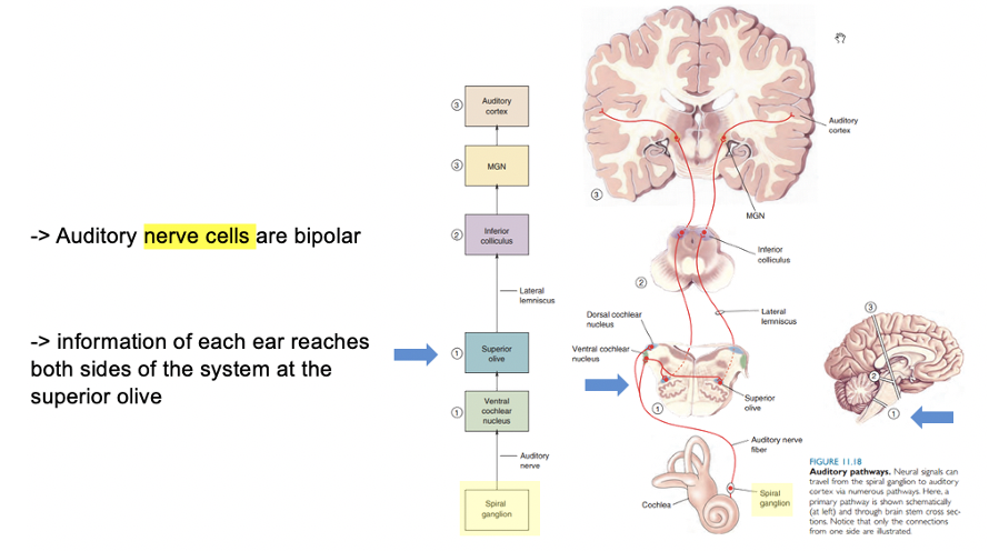 What are the key nuclei of the auditory pathway and what is their role?