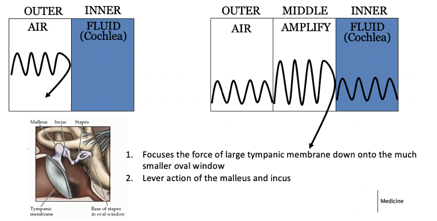 The sound wave is moving from air, which has a low impedance (low resistance) to an aqueous environment in the inner ear which has a high impedance (high resistance)
