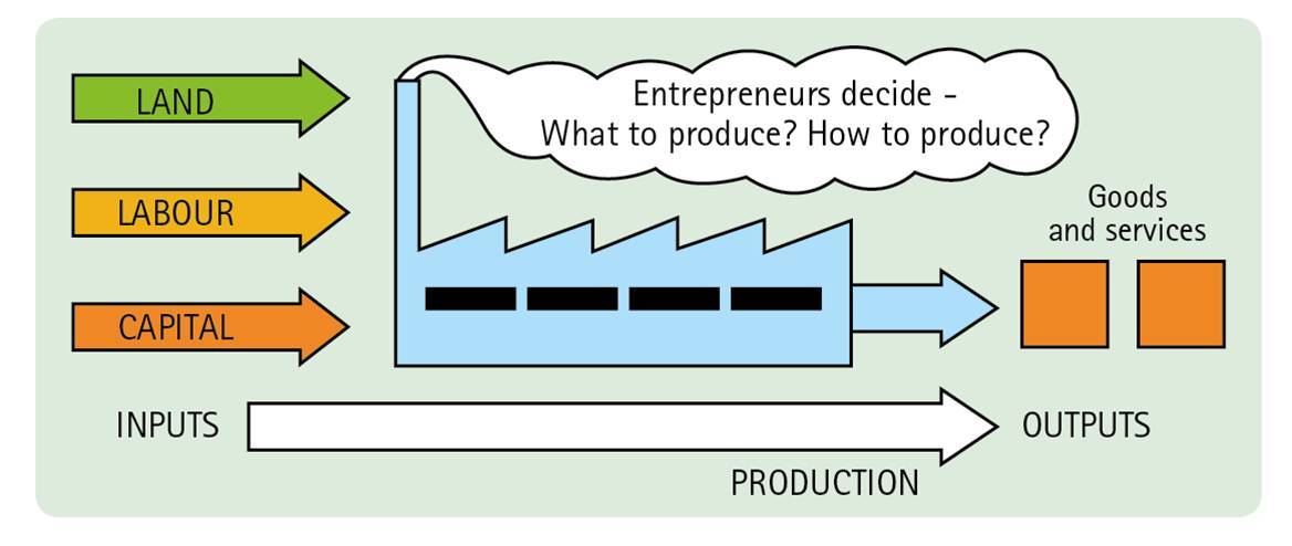 Scarce resources (land, labour and capital) used in the production of goods and services to satisfy consumer needs and wants.