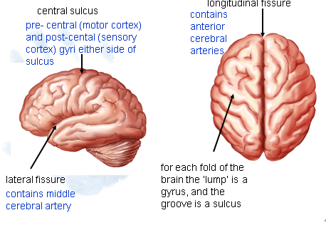 Pre-central (motor cortex) and post-central (sensory cortex) either side of sulcus