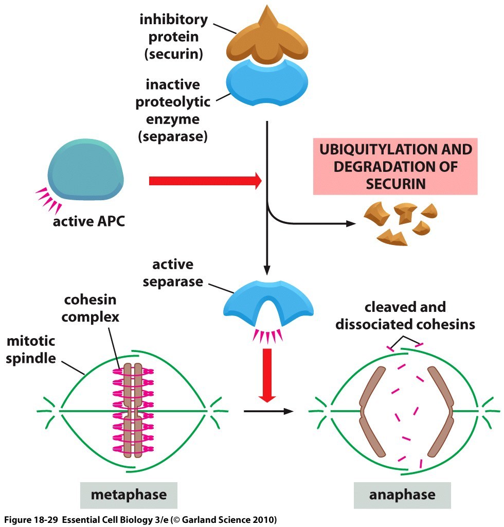 Which enzyme is activated as a result of all the kinetochores are attached to the spindle? (separase)