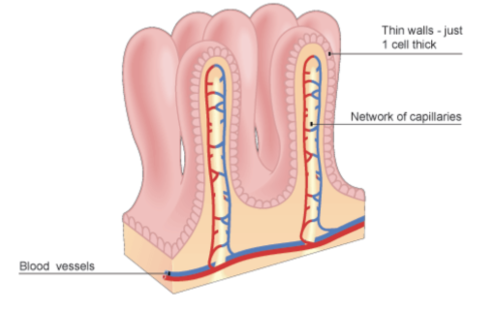 tiny finger-shaped structures that cover the inner surface of the small intestine & provide a large surface area through which digested food is absorbed