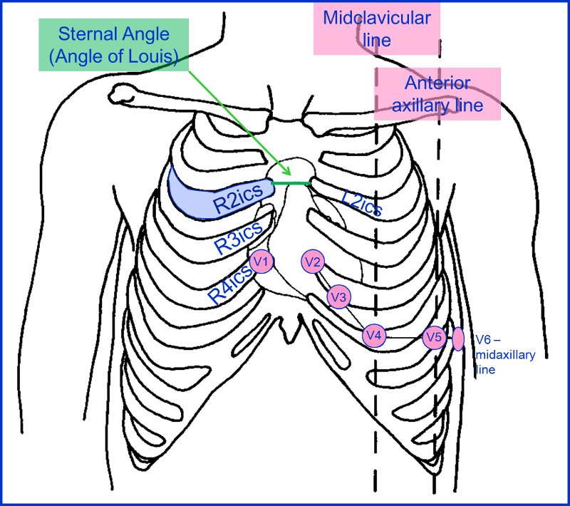 Draw the correct positions of the CHEST recording electrodes for performing a 12 lead ECG and the names of the leads