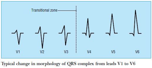 The transition zone is where the QRS complex changes from predominately negative to predominately positive, this usually occurs at V3 or V4.