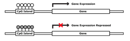 In general, DNA Methylation prevents transcription, and therefore reduces gene expression, by preventing the binding of transcription factors to the promoter regions of particular genes.