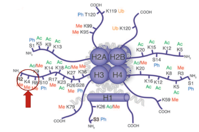 For example, H3K4Me3 means that on Histone 3, the Lysine at position 4 is tri-methylated