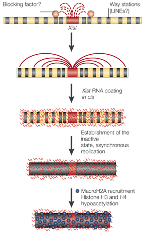 The inactivation of one of the two X chromosomes in every somatic cell in females