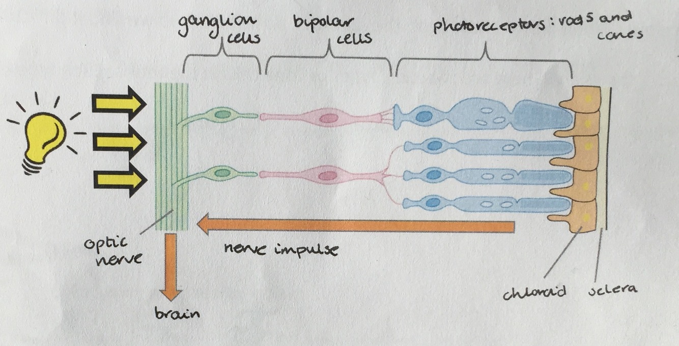 the oppotite happens in bright light: the pupils gets smaller and this stops too much light entering the eye and damaging it