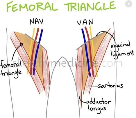 Describe the location of the femoral artery in relation to the nerve to feel the femoral pulse