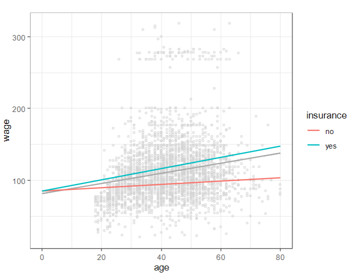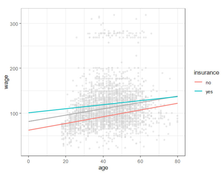 Two intercepts and two slopes: we study the main- and interaction effects of the numerical and nominal variable. Y = ß0 + ß1x1 + (ß2 + ß3x1) xinsurence = no