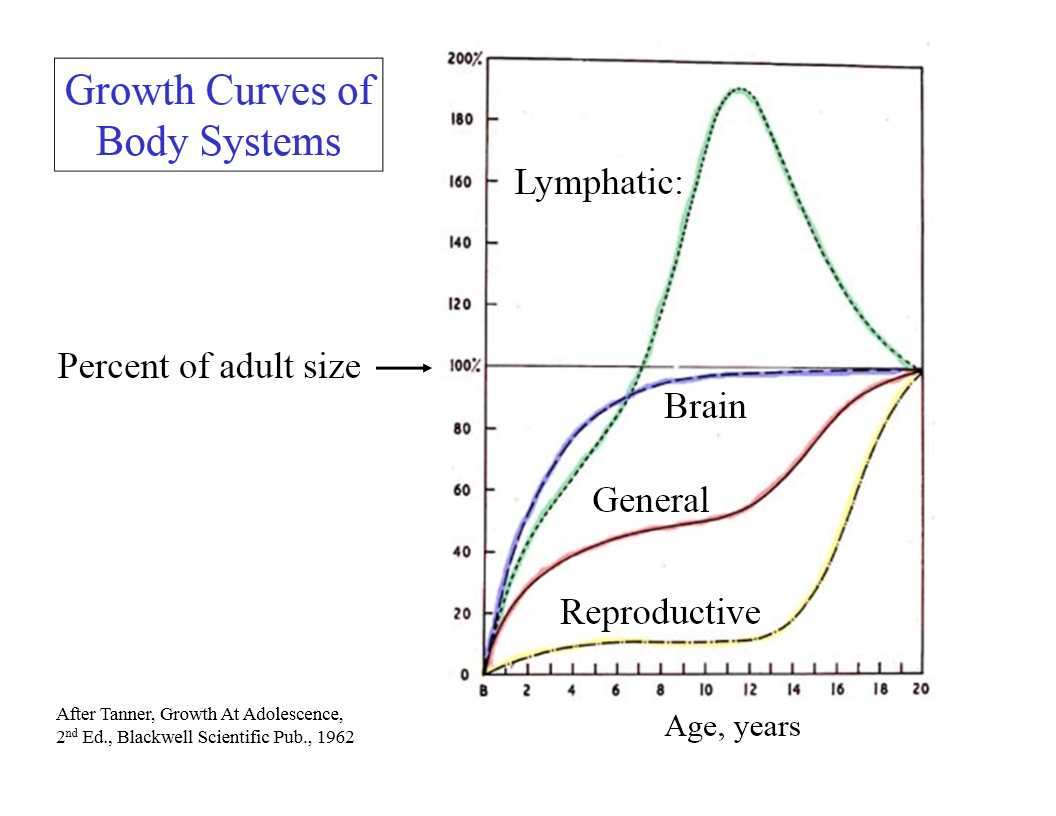 lymphatic system grows to a peak in early childhood and then shrinks as a person goes into adulthood