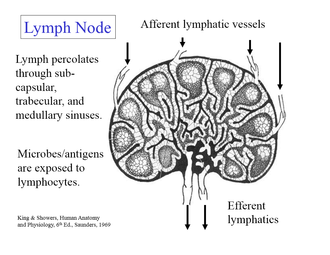 afferent lymphatic vessels -> sub-capsular, trabecular, and medullary sinuses -> efferent lymphatics