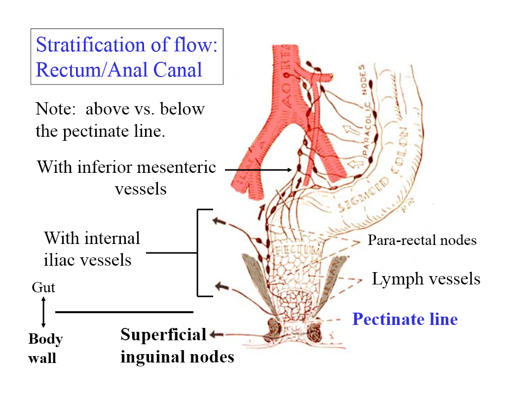 pectineal line separates internal iliac vessels and inferior mesenteric vessels with superficial inguinal nodes, which goes to the body wall