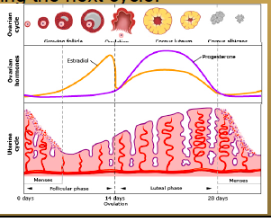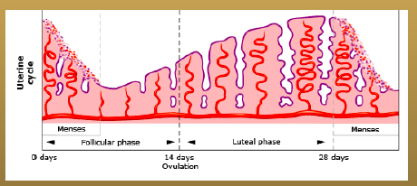 Progesterone conc. rise in the middle to late luteal phase and LH pulses slow to 1 pulse every 4 hrs and pulses of progesterone occur soon after these. Progesterone works to stabilize the endormetrium in case pregnancy occurs