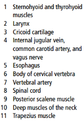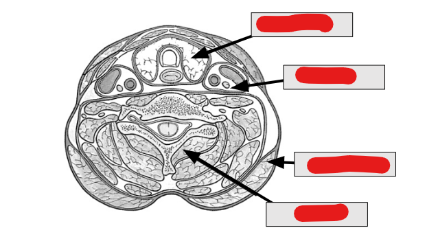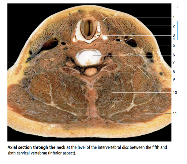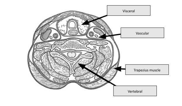 In the neck, a horizontal section can be described as having four compartments. List these and their contents.