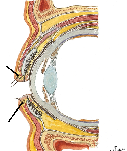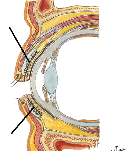 embedded in the tarsal plates - secrete lipid material to lubricate edges of the lids