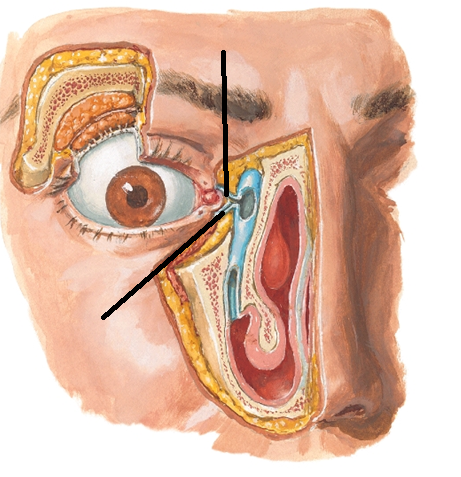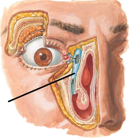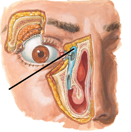 Extends inferiorly into the nose. Opens at the inferior meatus of the nasal cavity