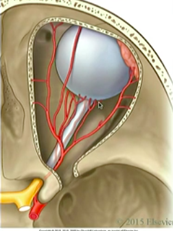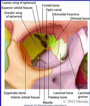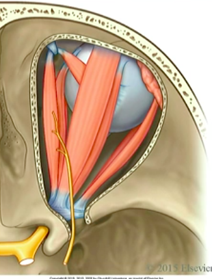 The Ophthalmic artery through the optic canal, has lots of branches that go to different areas.