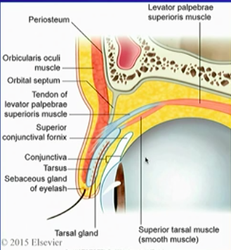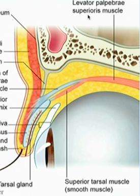 The Levator palpebral superioris muscle (LPS) and the superior tarsal muscle (ST) ((a smooth muscle)).
