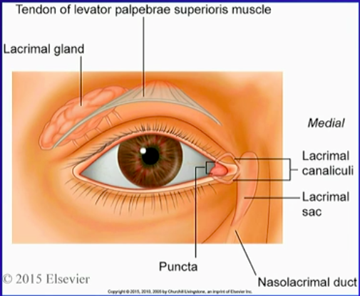 Puncta: a pump that drains tears from lacrimal canaliculi → lacrimal sac → nasolacrimal duct → nose (*why you get a runny nose when you cry!!)