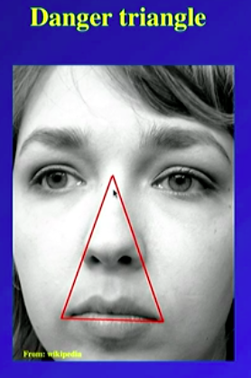 Ophthalmic Vein, which communicates with the cavernous sinus and the facial nerves. THis is therefore where infection may drain to the brain, the ‘danger triangle’