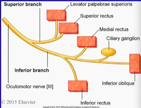 Inferior Branch: Medial rectus, inferior rectus, inferior oblique, ciliary ganglion