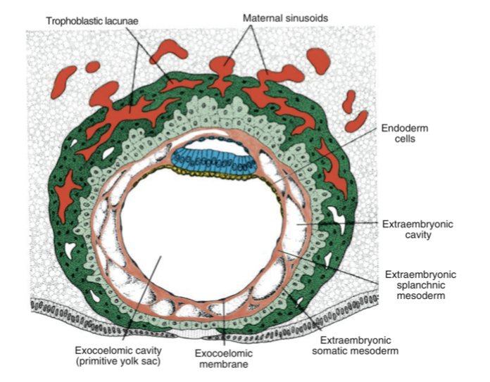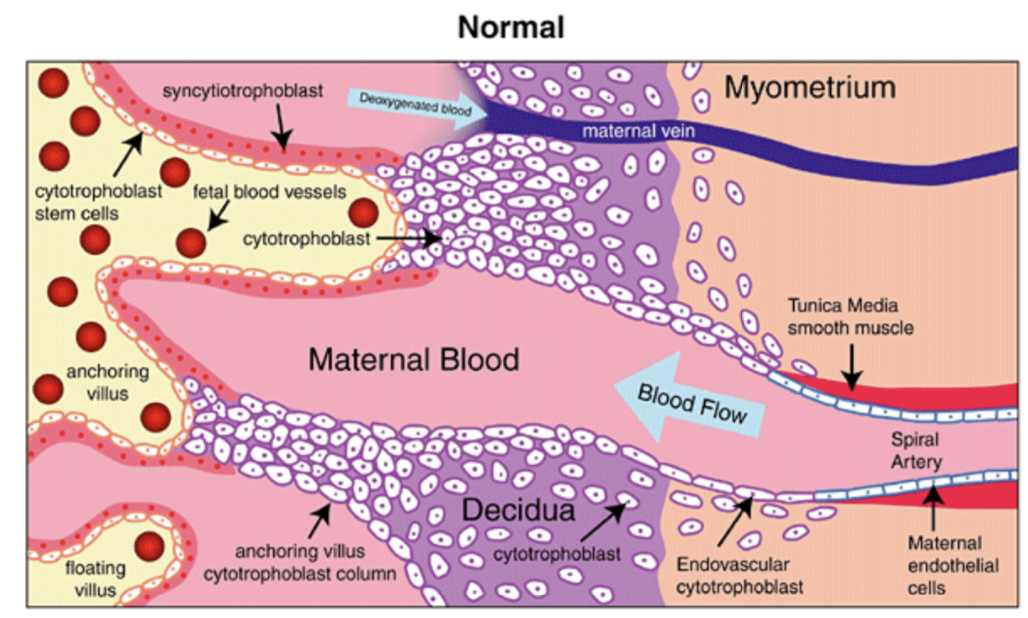 Trophoblasts block the spiral arteries, thereby preventing any more maternal blood from entering the lucane for the first 10 weeks of pregnancy.