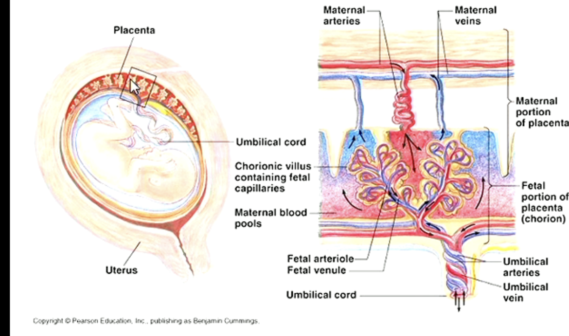 Fetal blood which is low in oxygen and nutrients flows through umbilical arterues to the capillaries of the villi and returns through the umbilical vein