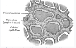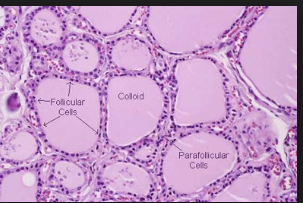 Colloid: gluey goo that is viscous and clear-coloured, how the produced hormone is stored in lumen (made mostly of Tg)