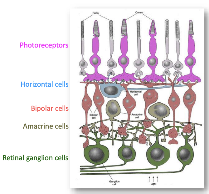 Retina has 5 different types of cells but for each category there are multiple subtypes: