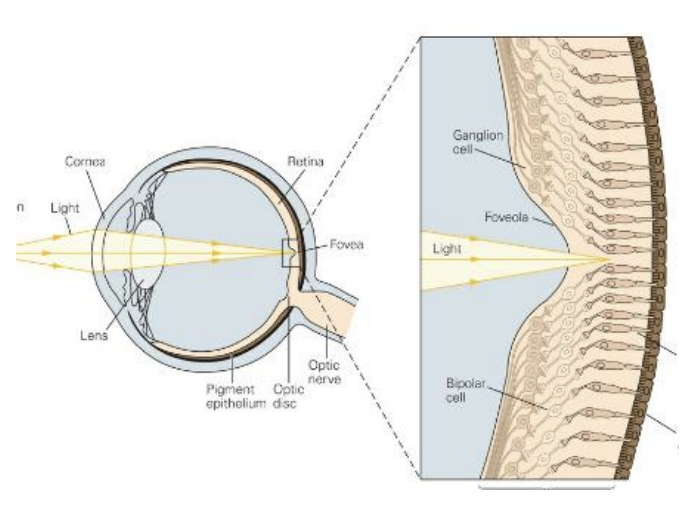 * In the fovea, all those other cells are pushed out of the way so that the photoreceptors in the fovea have direct access to light.