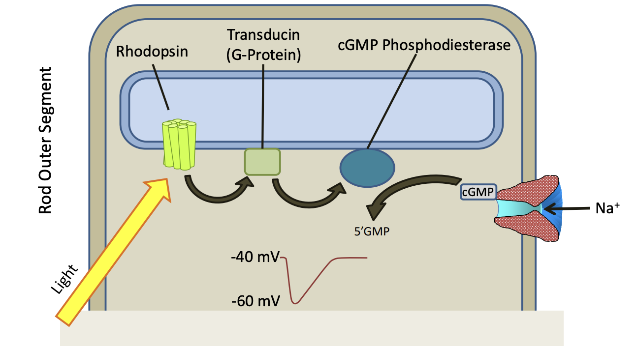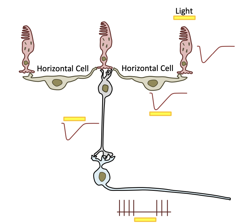 * In the dark, the photoreceptors are depolarized and continuously releasing neurotransmitter onto bipolar cells. When light shines onto the photoreceptor, it hyperpolarizes which closes those calcium channels and so the photoreceptor releases less neurotransmitter.