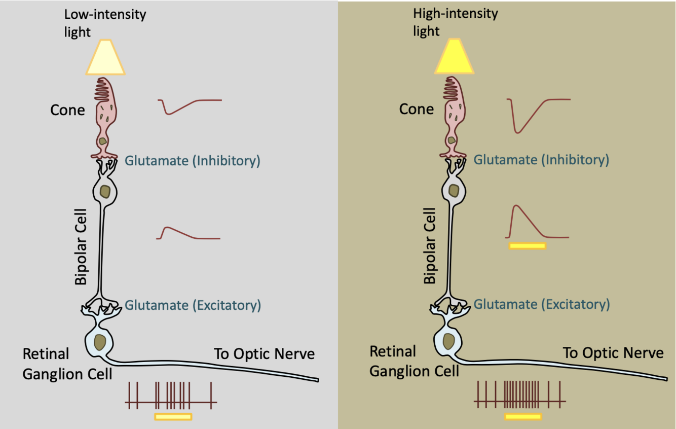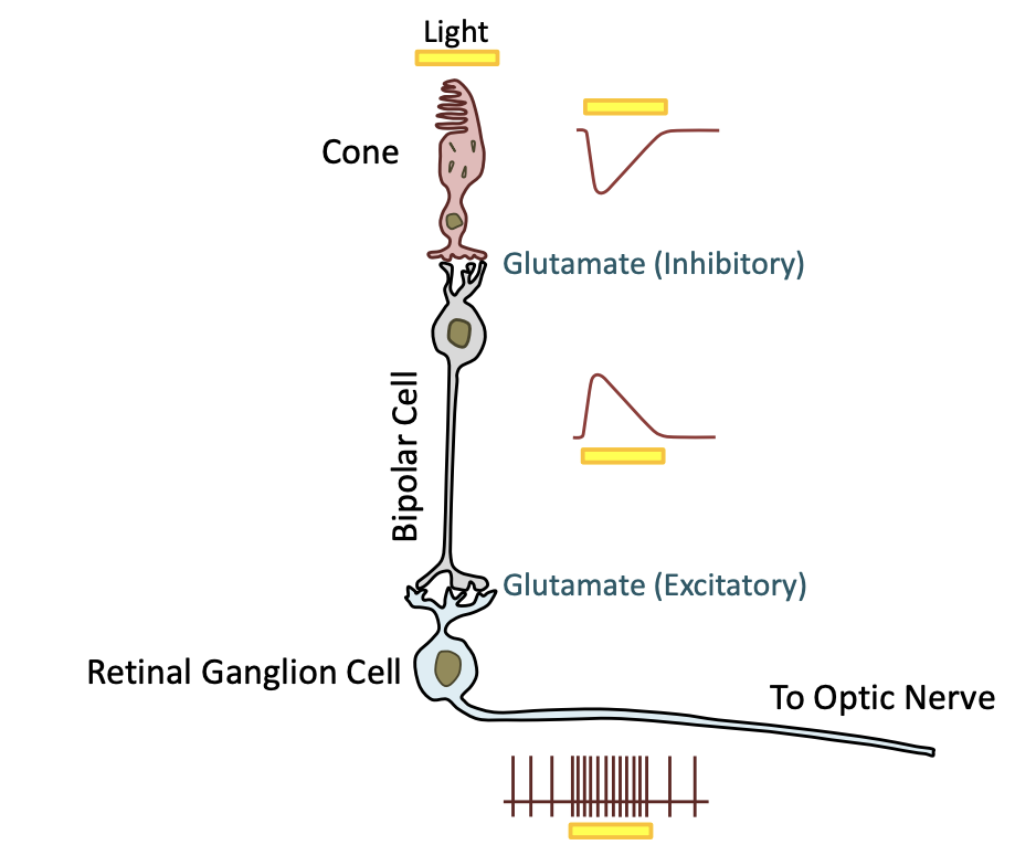 * The glutamate is actually hyperpolarizing the bipolar cell (it is acting as an inhibitory). So, in the dark, photoreceptor is releasing glutamate and so the bipolar cell is hyperpolarized. Therefore, the bipolar cell is not releasing neurotransmitters (bipolar cells are also releasing glutamate but in this case it is excitatory) onto the retinal ganglion cell. So, retinal ganglion cell is maybe firing a few APs in the dark, but it is basically quiet.