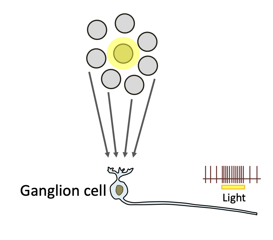 There are more photoreceptors than ganglion cells. This means that information is being sort of funneled into the ganglion cells.