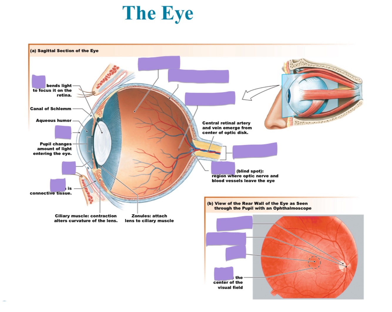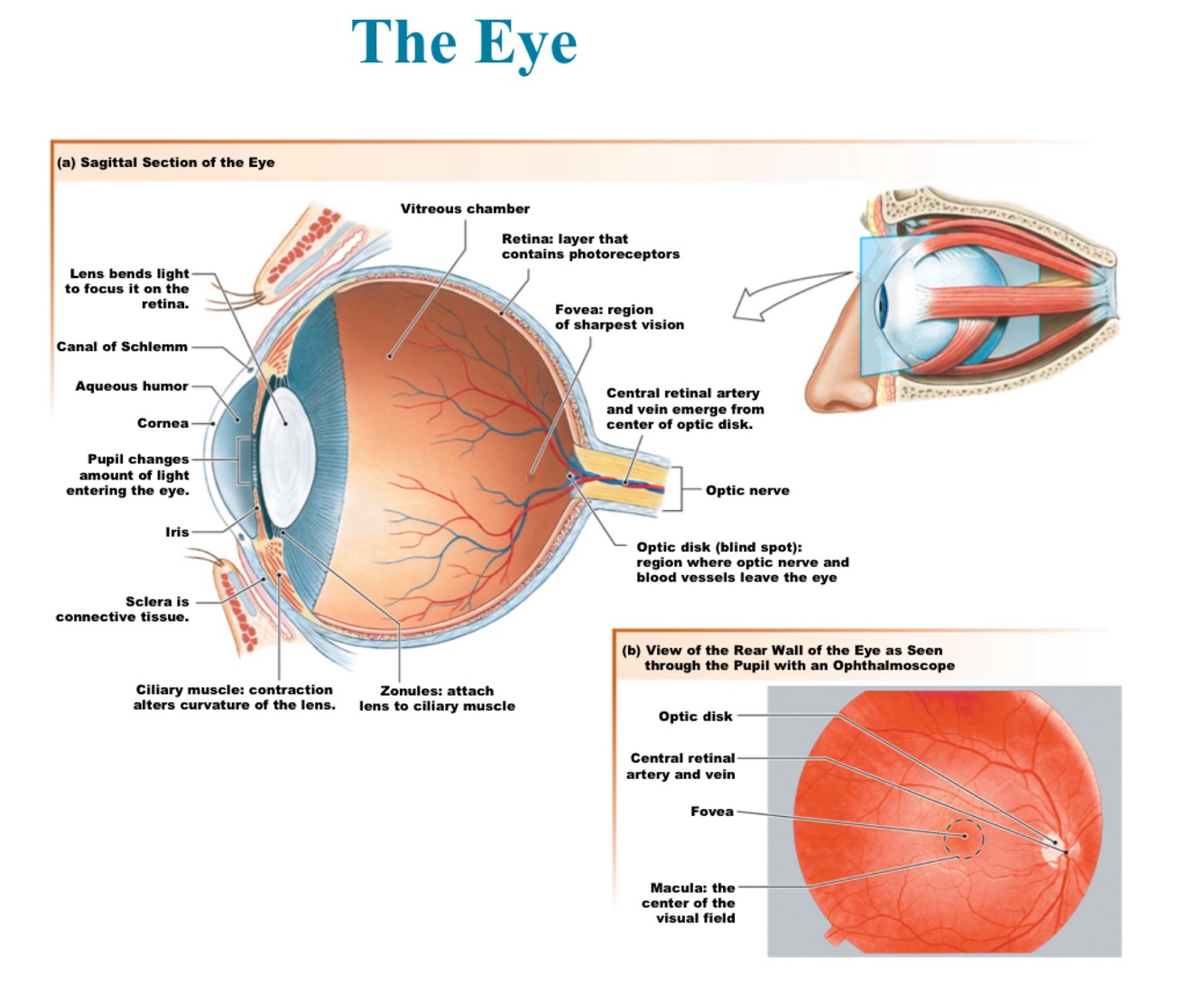 Optic Disk: region, where optic nerve and blood vessels, leave the eye. No photoreceptors on that part of the eye.