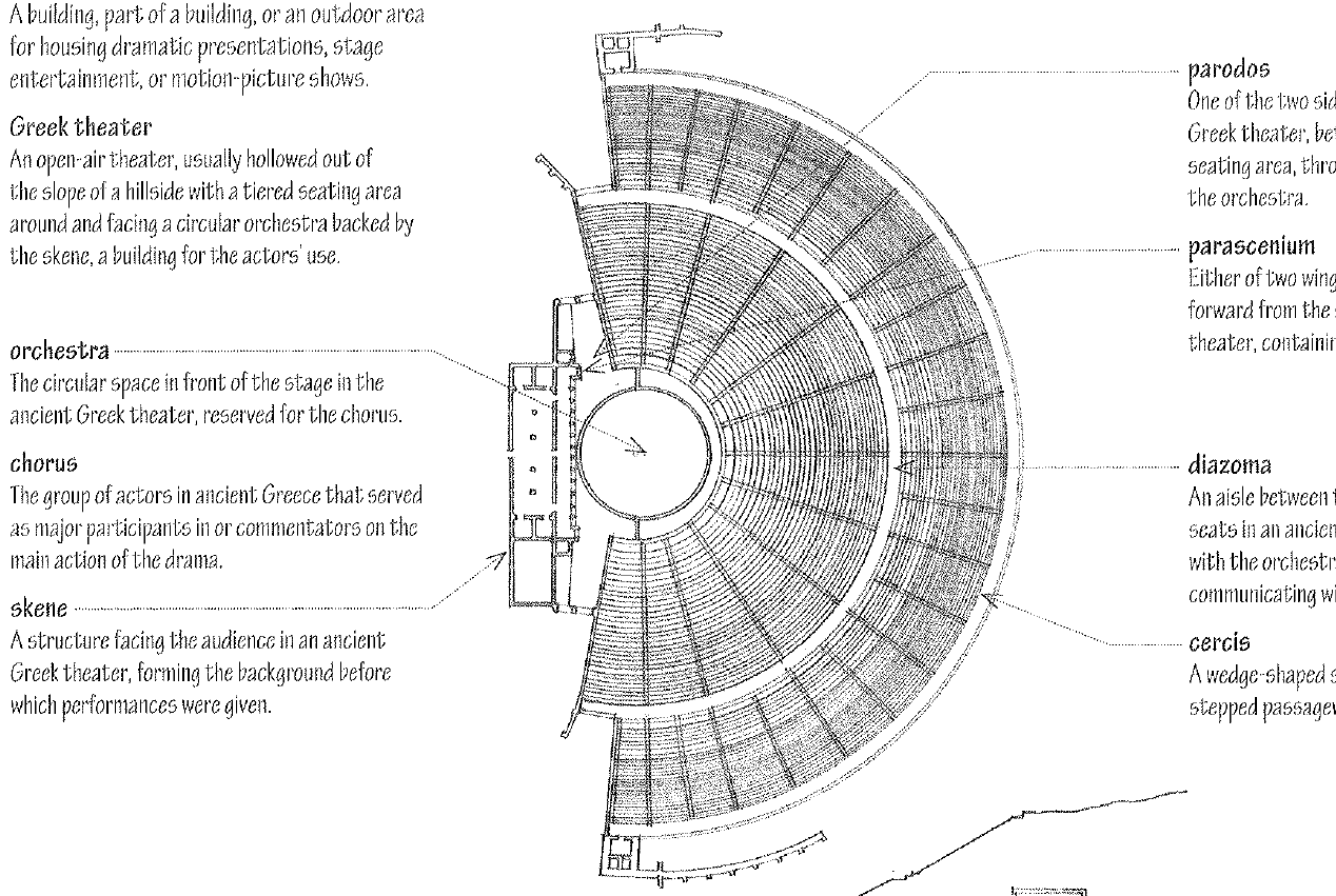 An open-air theater, usually hollowed out of the slope of a hillside with a tiered seating area around and facing a circular orchestra backed by the skene, a building for the actors’ use.