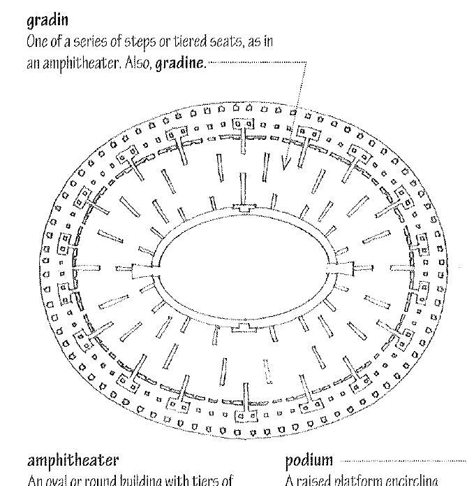 An oval or round building with tiers of seats around a central arena, as those used in ancient Rome for gladiatorial contests and spectacles.