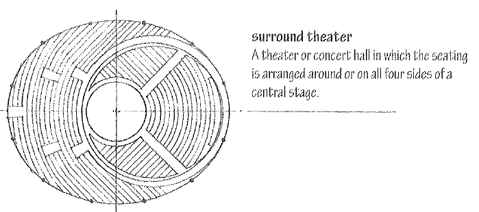 A theater or concert hall in which the seating is arranged around or on all four sides of a central stage.