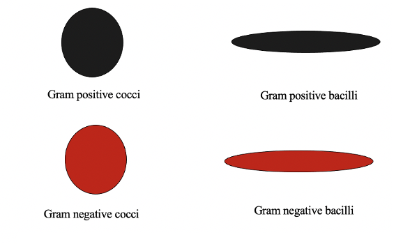 Gram positive has a thicker cell wall than negative. Gram positive stain stains organism blue/ black is retained. Gram negative- fatty outer cell membrane which doesn’t retain the blue/black, then stained with counter stain that appears red.