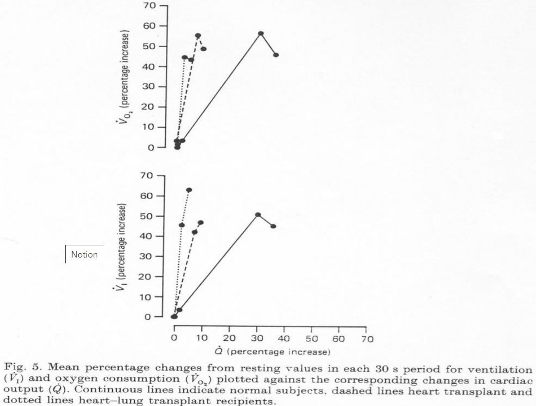 It seems that the ventilatory response to exercise includes a lot of redundancy. This means that removing one component (e.g. the cardiac output increase) is not sufficient to lose the response, but if we remove all other components, then removing the last component will indeed lead to loss of the response.