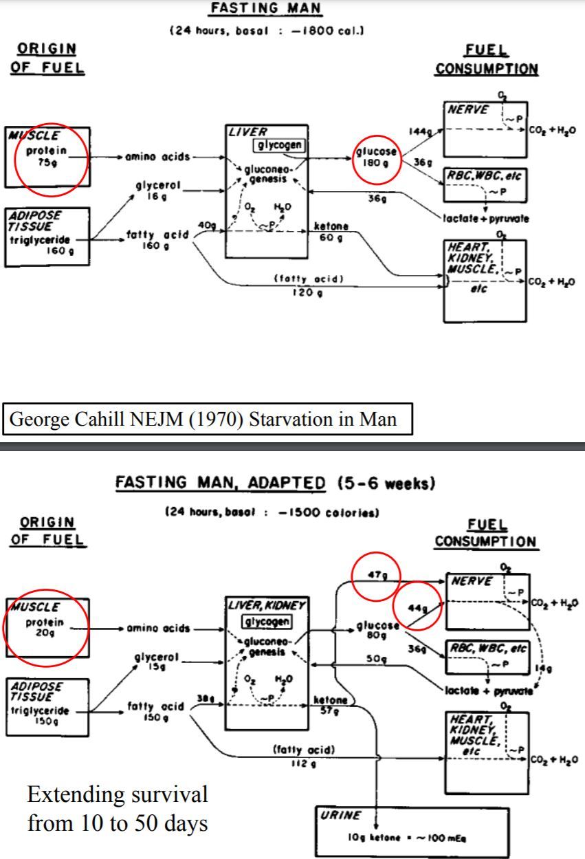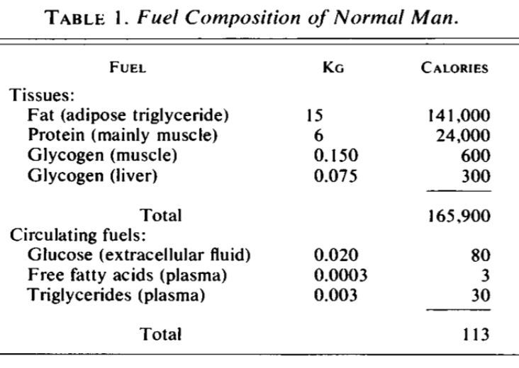 Describe the origin of fuel and fuel consumption after 24 hours of fasting in a normal subject and in a subject adapted after 5-6 weeks of fasting. Give a reference.