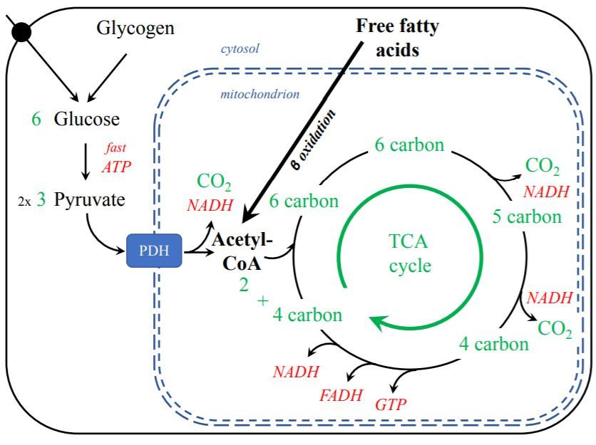 Draw how glycogen and fatty acids feed into the TCA cycle.