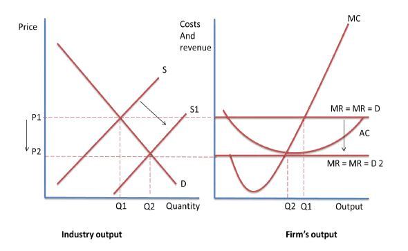 This causes the supply in the market to increase, as shown by the shift in the supply curve from S to S1. The price level in the market falls as a consequence. Since firms are price takers they must accept this new, lower price.